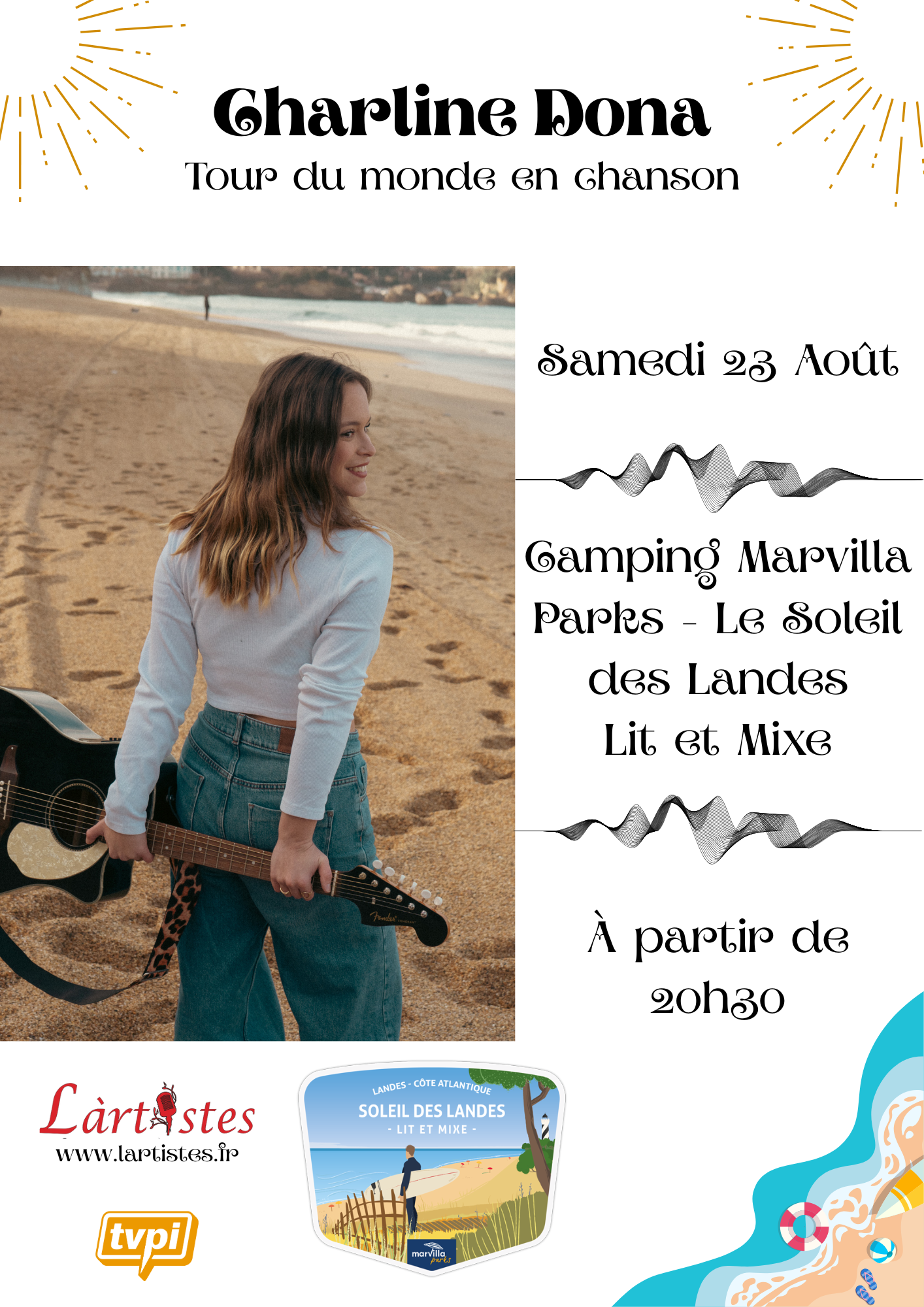 Charline Dona en concert ! Tour du monde de chansons en acoustique 23 août 2025 20h30 Camping Soleil des Landes - Lit et Mixe Envie d’un voyage sonore ?C’est justement le style de Charline !Et ouvert à tout public !!!